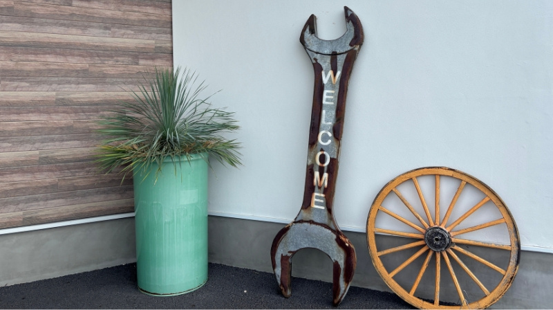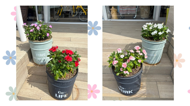 入口前には、季節のお花が咲いた鉢植えが並び、「Welcome to join us.」などのメッセージも添えられています。