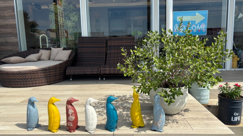 建物前には、カラフルなペンギンたちが整列!