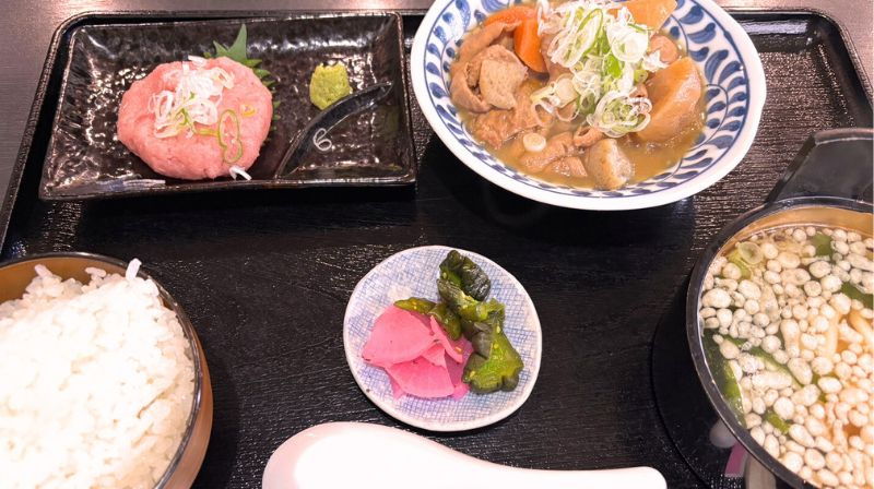 同僚のもつ煮定食も、ほっこり優しい味で美味しそうでした。 ごはん・漬物・うどん・なんとネギロトまでついていて、バランスもばっちり◎