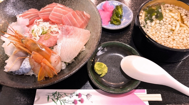 海鮮丼は、まぐろ・白身魚・えび・ネギトロなどがたっぷり乗っていて、彩りもきれい✨